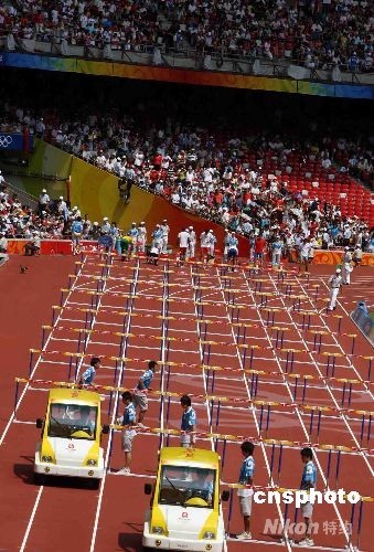 北京奥运会田径男子110米栏第一轮比赛,8月19日上午在北京奥林匹克公园内的国家体育场举行。中新社发 任晨鸣 摄