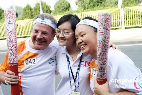 9月4日,残奥会火炬到达北京,将在北京的“一坛两园”展开最后一天传递行程。据北京市体育局副局长孙学才介绍,北京地区的240名火炬手既有工作在基层一线的普通劳动者,又有体坛名将、文艺工作者。其中,残疾人士共70名,占火炬手总数的近30%。中新社发 王昊 摄