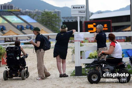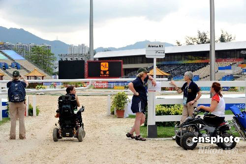 德国参赛选手(右一)到马术比赛场地参观视察。