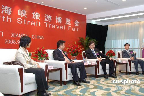 九月六日下午,福建省副省长洪捷序(右二)、国家旅游局副局长杜江(右一),在厦门会见参加第四届旅博会的台湾中华两岸旅行协会创会理事长许晋睿(左二)、澳门旅游局副局长文绮华(左一)等客商。中新社发 郑祚声 摄