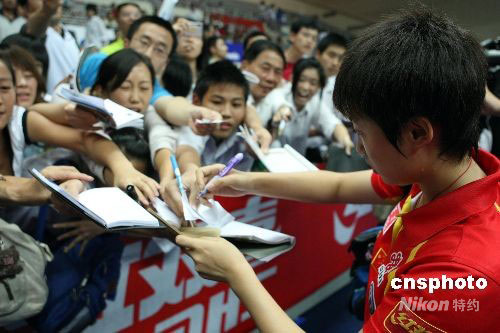 图为球迷争要乒乓国手郭跃签名。中新社发 汤彦俊 摄