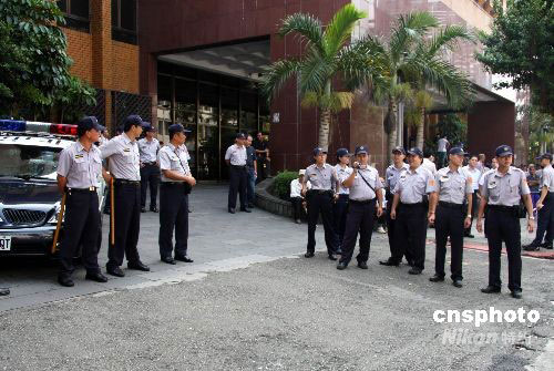 图为大批保安警察一早就在台北地方法院门口戒备。中新社发 陈立宇 摄