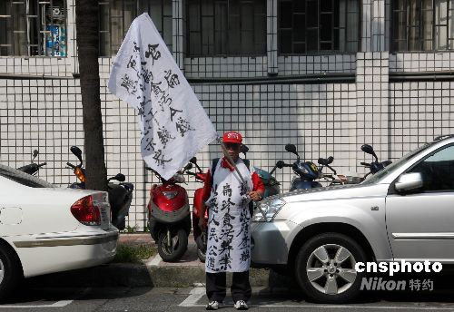 图为一名台湾民众今早在台北地方法院正门对面“呛扁”。中新社发 陈立宇 摄