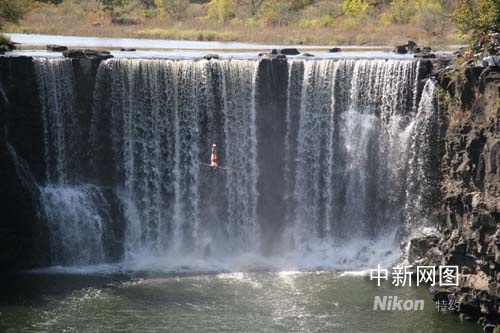 吊水楼瀑布,古时土著人名曰"发库",位于湖之北端,距"镜泊山庄"仅三公里。吊水楼瀑布酷似闻名世界的"尼亚加拉大瀑布"。湖水在熔岩床面翻滚、泡哮,如千军万马之势向深潭冲来,然后从断岩峭壁之上飞泻直下,扑进圆型瓯穴之中。潭水浪花四溅,如浮云堆雪,白雾弥漫;又似银河倒泻,白练悬空。水声震耳如有雷鸣。瀑布一般幅宽四十余米落差为十二米。雨季或汛期,瀑布呈现两股或数股迭落,总幅宽达二百余米。