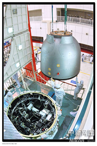 中国神舟七号载人航天飞船发射在即。图为飞船对接。袁明月 摄