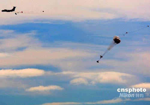 某部空军采取人车同投方式,连续空投装载12人的步兵战斗车12辆。中新社发 宋吉河 摄