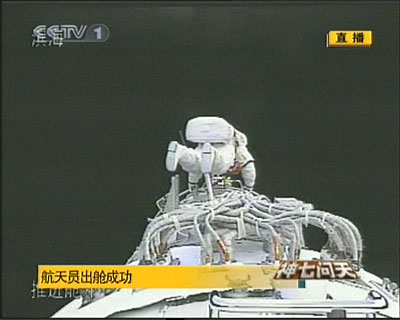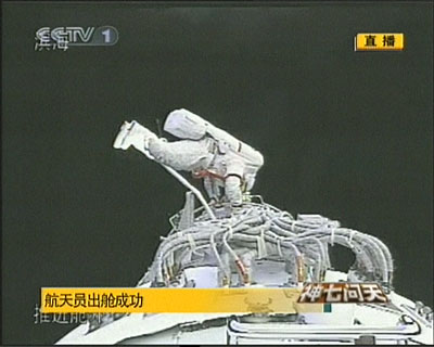 图:“神七”航天员翟志刚走出舱外开始实施出舱活动