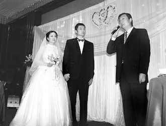 上海男篮主帅李秋平(右)登场证婚 洪南丽