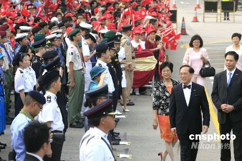 十月一日,香港金紫荆广场举行庆祝中华人民共和国成立五十九周年升旗仪式。仪式在八时正开始。香港特区行政长官曾荫权及多名官员出席。中新社发 张勤 摄