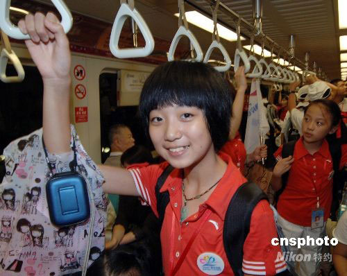 福建小营员乘坐台北捷运、快乐体验台北捷运。中新社发 刘可耕 摄