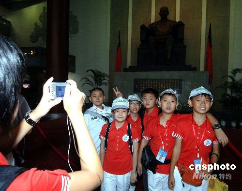 福建小营员前往台北孙中山纪念馆参观并在孙中山塑像前留影。中新社发 刘可耕 摄