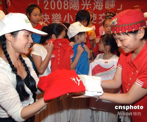 十月四日,参加“2008·阳光海峡”两岸快乐小天使活动的两岸快乐小天使及带队老师在该活动营主办方之一的台湾东森媒体集团在台北举行惜别晚宴上,互赠营服。中新社发 刘可耕 摄