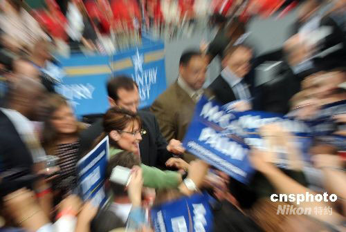 图为演讲结束后,佩林被大批支持者包围。中新社发 张炜 摄