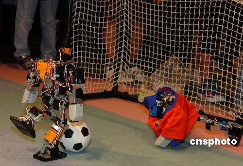 图为参展的机器人在进行射门和防守对抗。中新社发 朱沿华 摄