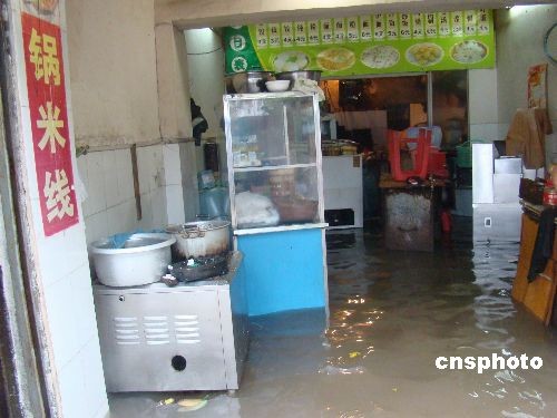 图为海口市一快餐店被水淹。中新社发 付美斌 摄