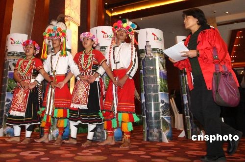图为来自台湾的原住民在会场外载歌载舞欢迎宾客。