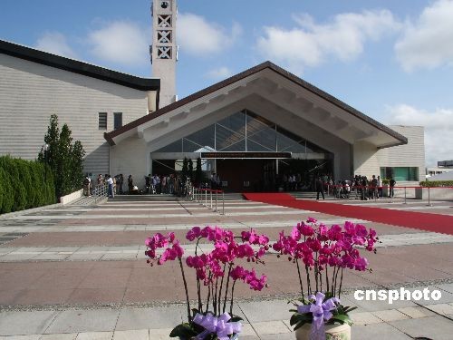 台塑企业创办人王永庆的遗体十七日由长荣班机运抵台湾,灵堂设在桃园县的长庚大学活动中心。图为灵堂外景。中新社发 耿军 摄