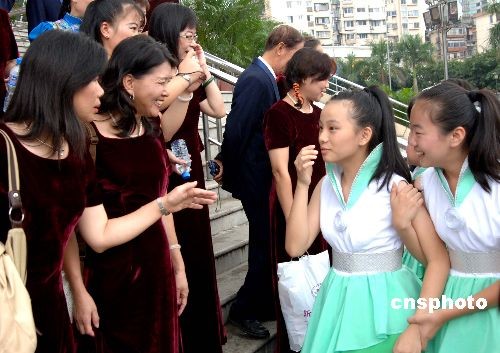 参加中国福州海峡两岸首届合唱节半决赛的金门县合唱团成员,在福州与福州市小茉莉艺术合唱团团员比赛间隙彼此交流演唱心得。