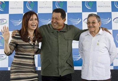 12月16日,在巴西东北部城市绍伊皮海滨,阿根廷总统克里斯蒂娜(左)、委内瑞拉总统查韦斯(中)和古巴国务委员会主席劳尔·卡斯特罗合影。