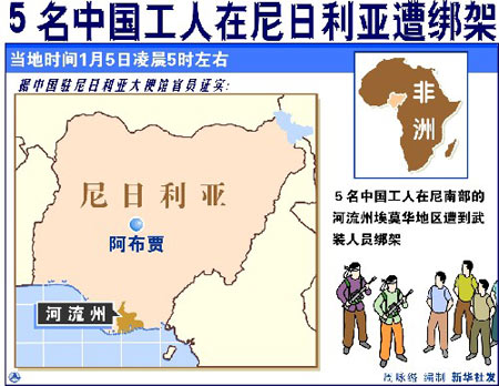 中新网1月6日电 5名中国电信工人5日早些时候在尼日利亚南部的石油产区“尼日尔三角洲”遭到不明身份武装分子的绑架。这5名中国工人被绑架的具体位置是哈考特港,但是目前下落不明。