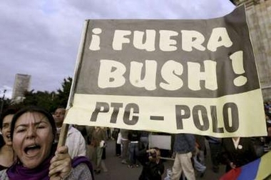 而就在布什到访前夕,波哥大国立大学的大学生们8日却走上街头,抗议布什到访。他们用石头等物品与防暴警察对抗,而警方则还之以催泪瓦斯。