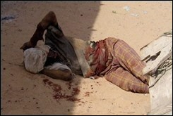 愤怒的人们当街焚烧了两具士兵尸体,还有人用绳子绑在另一具士兵尸体的脚上,拖着尸体游街。一名妇女手拿弯刀,一边高声辱骂埃塞俄比亚和索马里军队,一边踩踏这具尸体。这种情景让人不由得联想起上世纪90年代初,美军在索马里的类似遭遇。