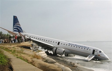 这架巴西制“安布瑞尔190”客机载有54名乘客及5名机组成员,从哥伦比亚卡里飞往北部滨海度假胜地圣塔玛塔。在飞机降落时,由于跑道湿滑,导致飞机冲出,半截栽进海中。有民众称事发后机场警报声大作。