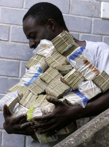 据英国媒体报道,非洲国家津巴布韦近来物价飞涨,通货膨胀率已达令人吃惊的100500%,当地货币的纸面价值已经低于纸的价值。5日,该国首都哈拉雷的一名男子费力的抱着一摞纸币出门采购日用品。