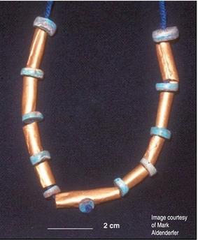 这次发现的项链以9颗金珠制成。这9颗珠嵌于若干个厚身圆筒中,并以一块粗糙青石的11个圆角点缀。中央的金珠附有一块贯穿中央一个小孔的土耳其石。