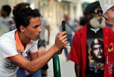 一位古巴年轻人正在用刚买的手机拍照。(资料图)
