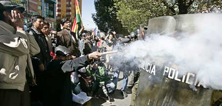 示威群众向使馆扔石块和鞭炮,要求降下使馆的旗子。警察发射催泪弹和水枪,运用防暴警车,与示威者发生冲突。至少有1名警察和2名示威者受伤。埃拉尔多的一位市议员说,“因为警察的镇压暴力我们失去了一场战斗,但是明天或某一天我们还会再来烧使馆”。警察用防暴车挡住使馆的主要入口。示威者高呼“正义,正义”的口号,曾冲破警戒线,威胁要烧使馆的大楼。前国防部长曾卷入2003年10月造成67人死亡和400人受伤的事件,那次事件以后当时的德拉索达总统被迫辞职。民意测验表明,莫拉莱斯总统在埃拉尔托市的民众支持率高达70%.(管彦忠)