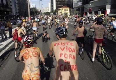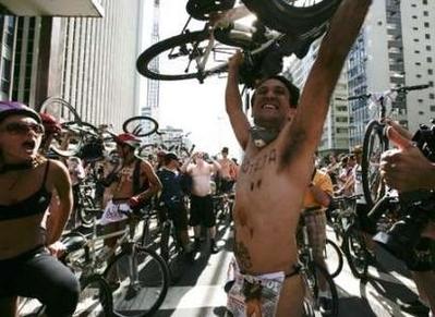 中新网6月16日电 大约二百名环保分子十四日脱去衣服,以半裸的姿态在巴西大城市圣保罗进行了一次瞩目的示威行动,一同踏单车经过人来人往的市中心街道,吸引了大批途人围观。他们抗议当地的汽车喷出大量废气,污染环境,但政府当局没有采取措施改善空气质素,又抗议该市的道路环境欠佳,对踏单车的人士构成危险。