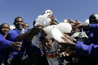 据《星岛日报》消息,在肯尼亚首都内罗毕西北200多公里外的一个乡村,居民3日早上起床时,发现草地一夜间铺上了一层冰雪,很多村民一生都未见过下雪,有人拾起冰块消暑,亦有人乘机打雪战。