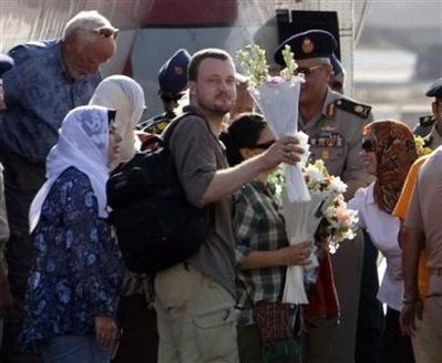 一名获救的外国游客在抵达埃及后受到热烈欢迎。