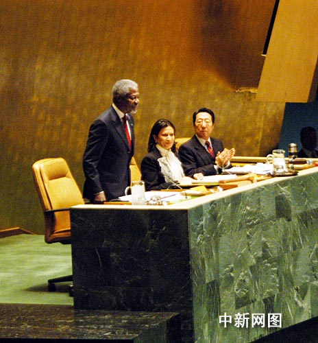 第六十一届联大十四日以全体鼓掌的方式通过一项决议,向即将在本月底任期结束的联合国秘书长安南致敬。图为安南起身向联合国各会员国代表致意。作 者:谭宏伟