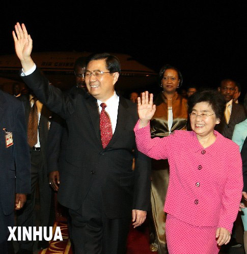 当地时间20时许,胡锦涛乘坐的专机抵达雅温得国际机场。胡锦涛和夫人刘永清在机场受到喀麦隆总理伊诺尼夫妇等的热情迎接。
