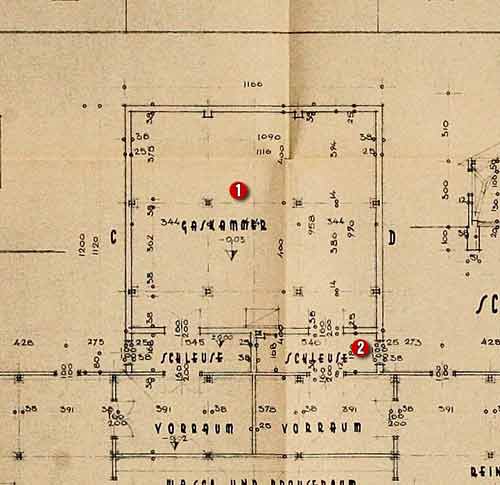 图纸上标有红色符号①处即为纳粹杀人用于的毒气室,②处为隔离室,再下方为更衣室。