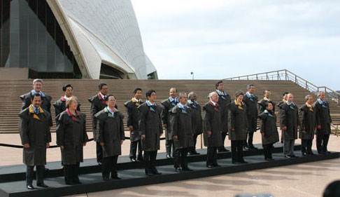 2007年悉尼APEC峰会的各领袖会穿什么“民族服装”,主办方一直保持高度神秘。直到各领袖在世界媒体前亮相之时才揭晓:原来澳洲选择了深褐色的皮夹克,样子很容易使人联想到厚重的雨衣。