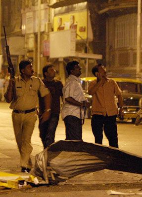 11月27日,警察在印度孟买戈拉巴街区的恐怖袭击现场警戒。