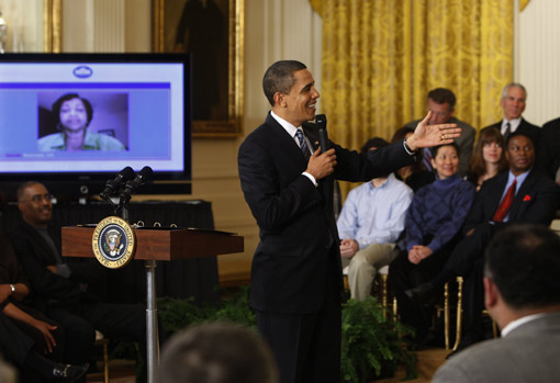 奥巴马当日在白宫首次以网络视频方式回答网友及现场民众代表的提问。就业、医疗、教育、房贷等民生问题是当日奥巴马网络答疑的重点。