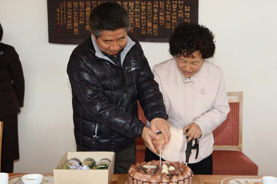 2009年1月16日,卢武铉和夫人一起切蛋糕的场景。