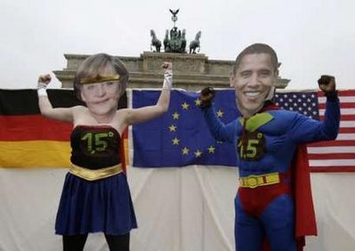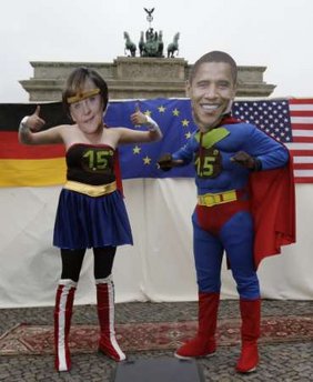 中新网6月26日电 据星岛环球网报道,德国一个气候活动组织25日在柏林勃兰登堡门前抗议。他们扮成德国总理默克尔和美国总统奥巴马的模样,穿上超人服装,呼吁默克尔在气候问题上与奥巴马商谈时要维护此前“欧盟气候超人”的地位。