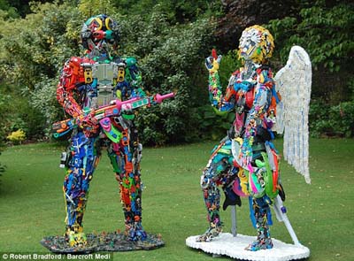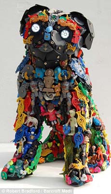 据报道,这名叫罗伯特的男子表示,看到自己的两个孩子有很多玩旧的玩具,但觉得弃之可惜,为了让这些废旧物品仍能发挥作用,他决心把它们打造成艺术品。于是他将各种颜色、形状、质地的小玩具用胶水、木棍和螺丝钉等粘合组装在一起,制成了大型模型玩具。一个大模型用了将近3000块小玩具。