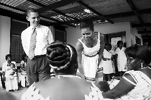 很多加纳人对奥巴马这位有着非洲血统的美国总统的到来持欢迎态度。这几天,加纳首都的主要街道被奥巴马和米尔斯的画像装点得“非常热闹”。奥巴马一家的大幅海报成为街头小贩兜售的“畅销货”。