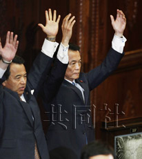 众院解散后,日本首相麻生太郎(右)举臂高呼万岁。21日下午摄于国会。(完)
