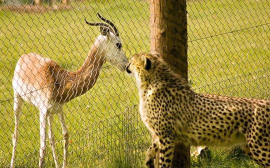豹子和羚羊在野生动物界本是一对你死我活死对头,而在这家动物园中,性格温顺随和的印度豹竟然对一只羚羊格外友好。它们被一个围栏相隔,但它们常常靠在一起玩耍,互相摸摸对方的鼻子,靠在耳边“窃窃私语”。这些举止常把周围的游客逗笑。为它们拍摄照片的Patrick称:“这种场景很甜蜜。”