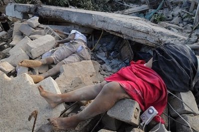 遇难者的尸体在海地首都太子港随处可见。儿童们的尸体被放置于学校旁边;妇女的尸体则被沿街排列,在她们已经僵硬的脸上还保留着震惊的表情;男人们的尸体上覆盖着塑料布或者床单。