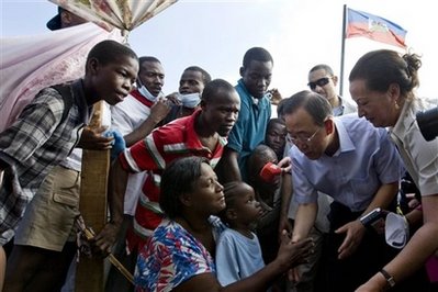 联合国秘书长潘基文一行17日在海地了解地震造成的损失并掌握了第一手的灾情资料。面对严峻的救援情况,日渐绝望的海地灾民,在被问到是否有足够的救援物资满足数以百万计的灾民时,潘基文说:“我真心希望并呼吁海地人民要更加耐心”,他还表示不希望看到发生骚乱。