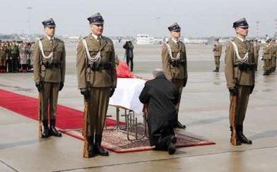 据报道,享年66岁的波兰第一夫人玛丽亚的遗体13日抵达华沙奥肯切(OKECIE)国际机场,一辆灵车将载着覆盖波兰国旗、装有玛丽亚遗体的灵柩穿越街道,前往华沙总统府。已故总统卡钦斯基的孪生哥哥与卡钦斯基女儿前来机场迎接玛丽亚的遗体。街道两边数以万计的民众夹道站立,等待总统夫人灵柩的到来,他们神情哀痛,默默无语。