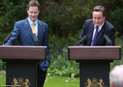 报道称,首相卡梅伦和副首相克莱格肩并肩的站在光影斑驳的唐宁街花园。他们共同分享幽默,数次含义颇深的眼神交流让所有人都认为他们并不是要刻意制造欢乐的气氛。